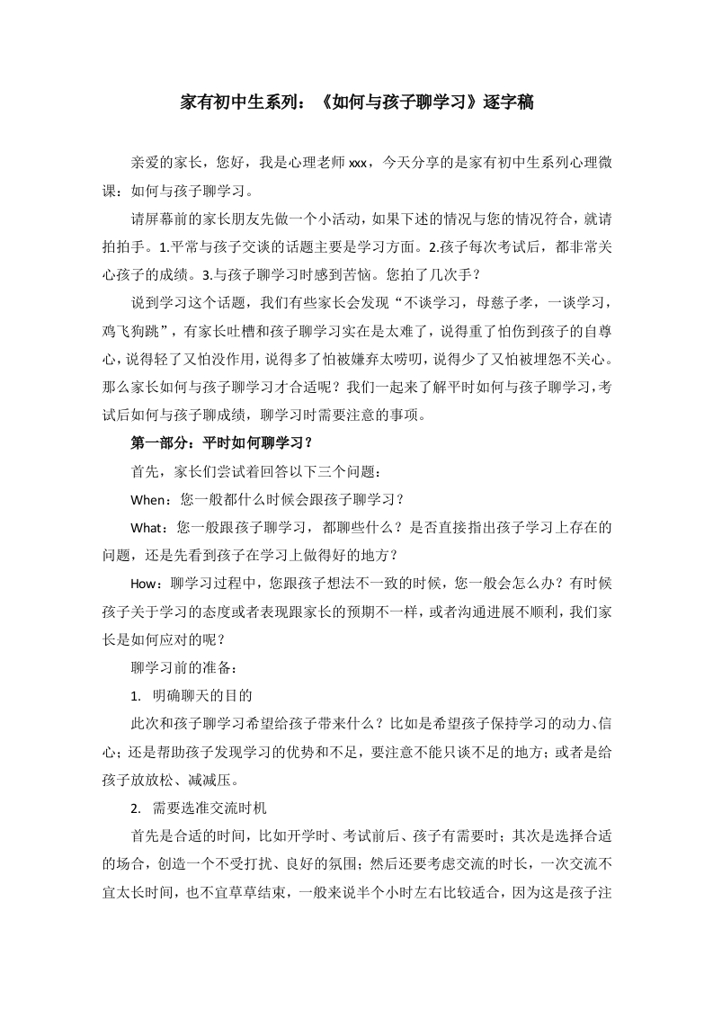【初中】【心理微课】主题家长会:家有初中生系列:如何与孩子聊学习