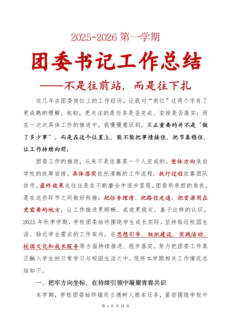 首页教务管理计划总结2025-2026第一学期团委书记工作总结(不是往前站,而是往下扎)
